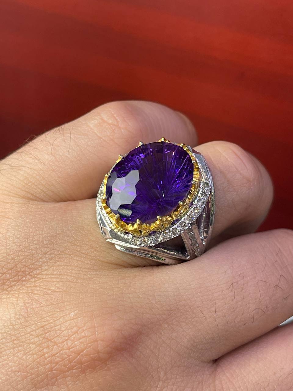 این انگشتر فاخر ساخته شده از بهترین متریال نقره با عیاد ۹۲۵ و با بکارگیری به روزترین و زیبا ترین طرح توسط استادشرفیان است این انگشتر مخراجی شده با برلیان اصل است و سنگ این انگشتر آمیتیس اصل میباشد که از سنگ های جواهراتی بسیار پرطرفدار میباشد و از خواص آن میتوان اشاره کرد به: