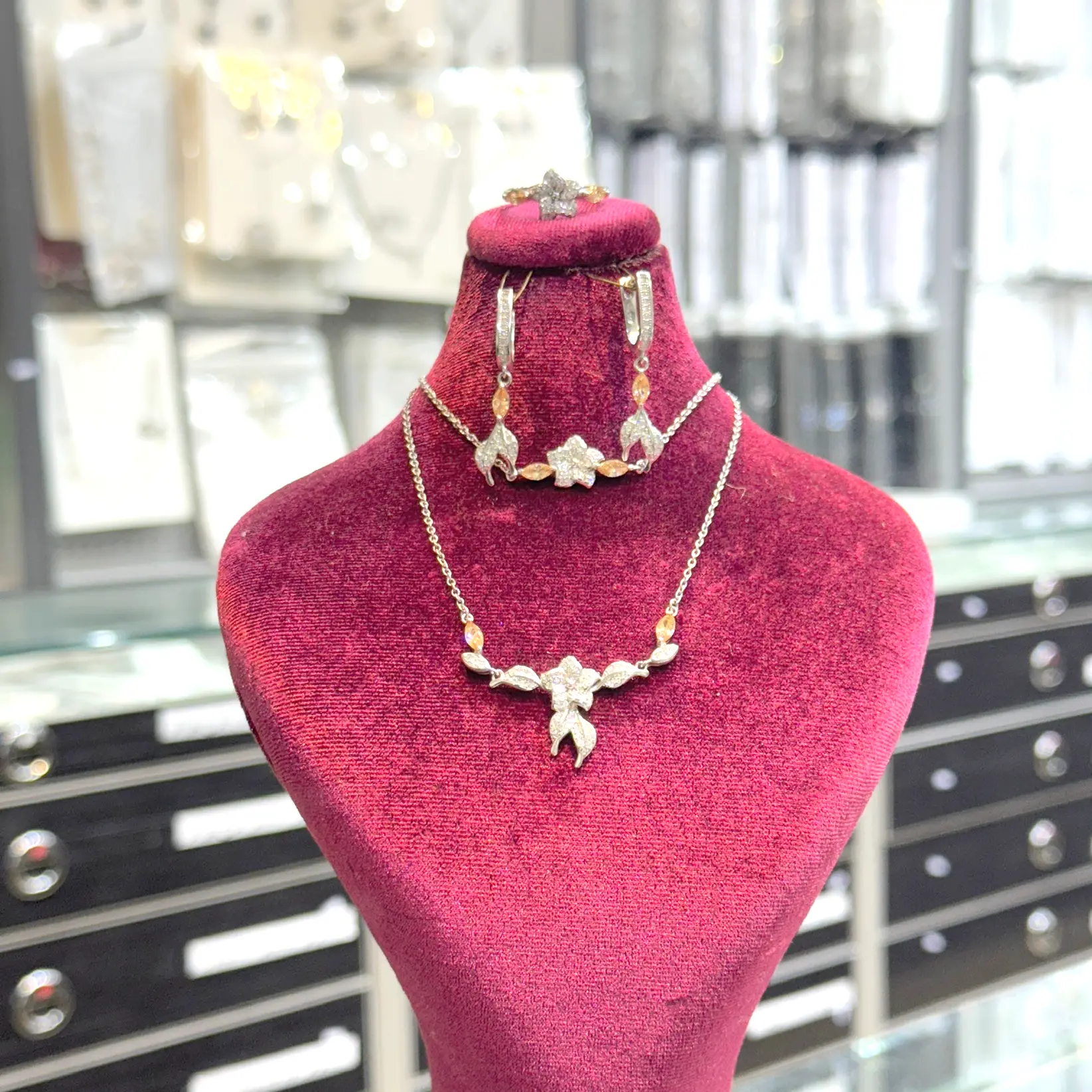 این نیمست نقرهای، با رنگبندی کلاسیک و طراحی هنرمندانه، بهراحتی با انواع لباسهای مجلسی و رسمی ست میشود. اگر به دنبال زیورآلاتی هستید که هم خاص باشد و هم ماندگار، این مدل گل و برگ دقیقاً همان چیزیست که نیاز دارید. زیبایی طبیعی برگها در کنار درخشش سنگها، ترکیبی از لطافت و شکوه را به شما هدیه میدهد.