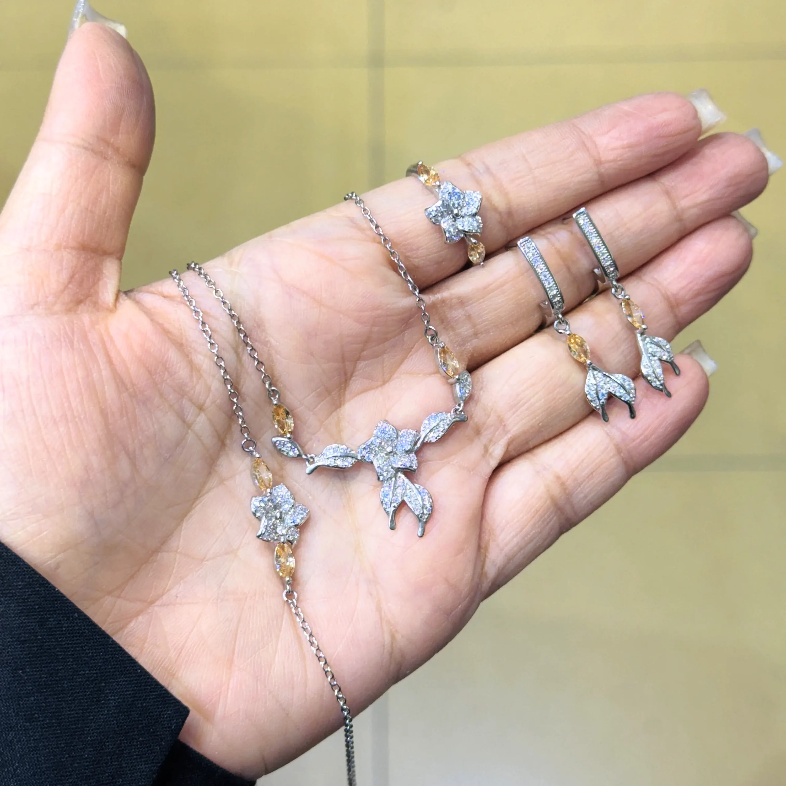جنس این زیورآلات از استیل ضدزنگ با روکش نقرهایست که در برابر تغییر رنگ و کدر شدن مقاوم بوده و در طول زمان زیبایی خود را حفظ میکند. سنگهای درخشان بهکاررفته در طراحی برگها و گلها، در نور طبیعی و مصنوعی برق خاصی دارند که توجهها را به خود جلب میکند. این نیمست نهتنها برای عروسها، بلکه برای بانوانی که به دنبال زیورآلات خاص و متفاوت هستند نیز انتخابی عالیست.